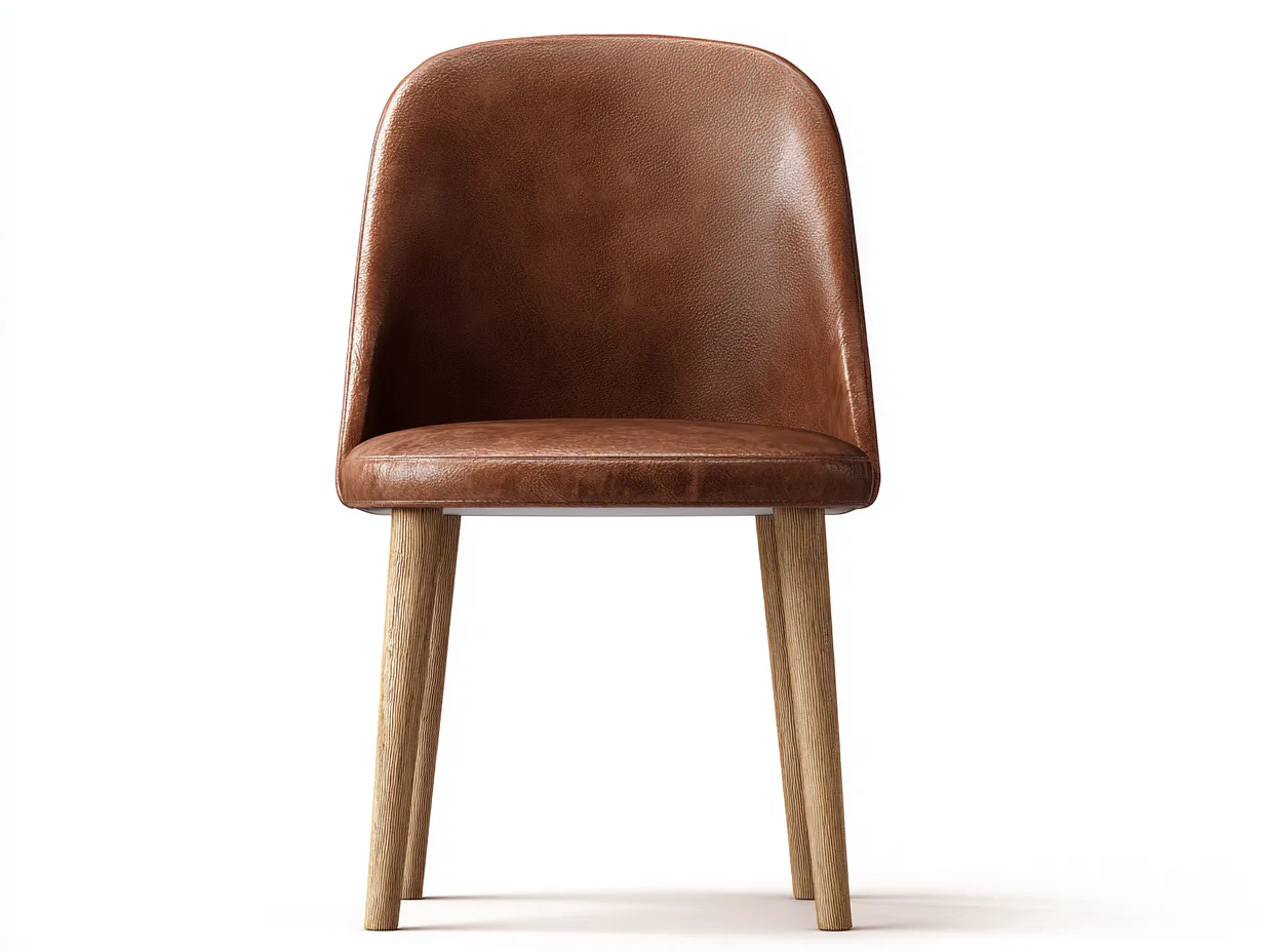 Die Sitzschale ist mit braunem Kunstleder bezogen, dessen fein strukturierte Oberfläche dem Stuhl eine warme und natürliche Optik verleiht. Die stabilen Holzbeine in heller Holzfarbe sorgen für eine zuverlässige Standfestigkeit und unterstützen eine langlebige Nutzung. Die integrierte Polsterung im Sitzbereich bietet zusätzlichen Komfort im täglichen Gebrauch.