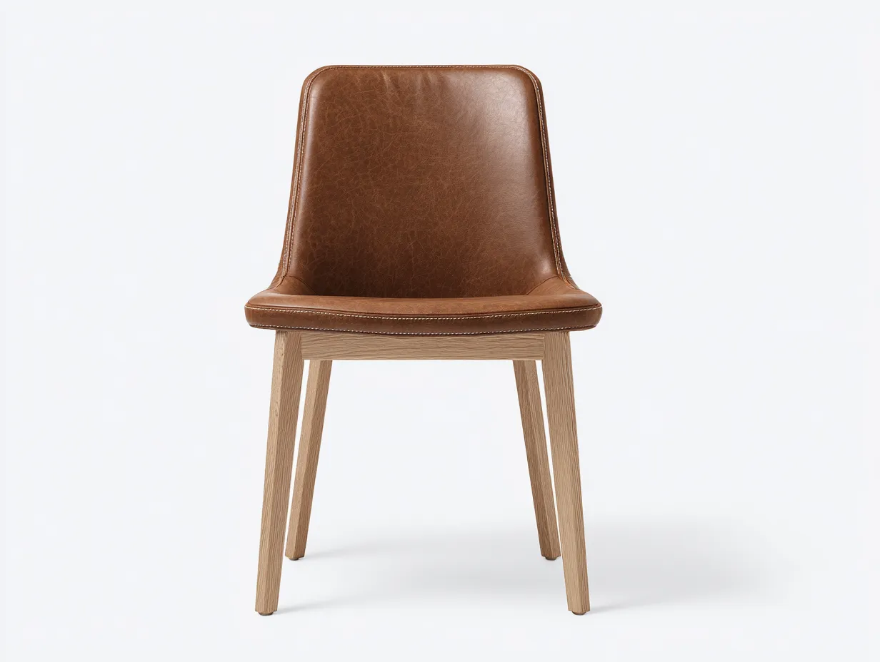 Die Sitzfläche ist mit braunem Kunstleder bezogen, das eine fein strukturierte Oberfläche besitzt und eine warme Optik erzeugt. Die stabilen Holzbeine in natürlicher Holzfarbe bilden eine zuverlässige Grundlage und unterstützen eine solide Standfestigkeit. Die integrierte Polsterung trägt zu einem komfortablen Sitzgefühl im Alltag bei.