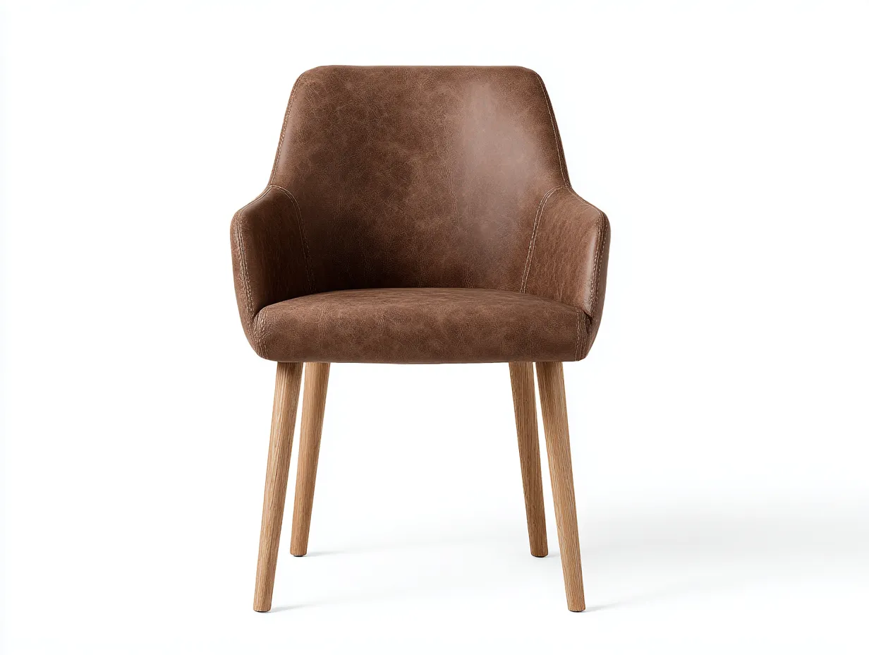 Die Sitzfläche und Rückenlehne sind mit braunem Kunstleder bezogen, das durch seine feine Struktur eine warme und elegante Optik erhält. Die stabilen Holzbeine in natürlicher Holzfarbe bieten eine solide Grundlage und sorgen für eine zuverlässige Standfestigkeit. Die integrierte Polsterung unterstützt den Sitzkomfort im täglichen Gebrauch.
