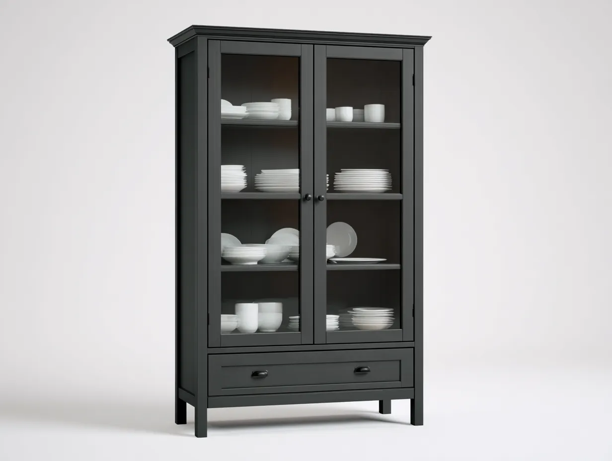 Gefertigt aus Holz und Glas bietet die Vitrine eine stabile Konstruktion für den täglichen Gebrauch. Die Oberfläche in Dunkelgrau unterstreicht den klaren Möbelcharakter und lässt sich vielseitig mit hellen wie dunklen Wohnfarben kombinieren. Die Türen mit Glaseinsatz unterstützen eine offene Optik, während die sauber verarbeiteten Kanten und die solide Ausführung auf eine langlebige Nutzung ausgelegt sind.
