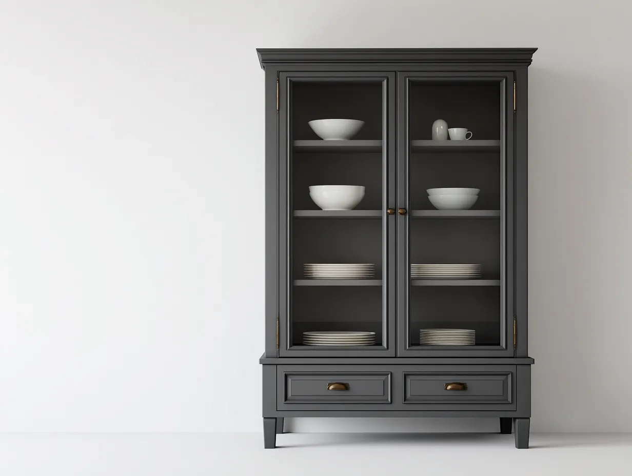 Die Vitrine besteht aus Holz und Glas und bietet eine stabile Konstruktion für den täglichen Gebrauch. Die Oberfläche in Dunkelgrau verleiht dem Möbelstück eine dezente und elegante Ausstrahlung. Die transparenten Glastüren ermöglichen eine klare Sicht auf die aufbewahrten Gegenstände, während sorgfältig ausgearbeitete Details und stabile Beschläge die langlebige Nutzung unterstützen.